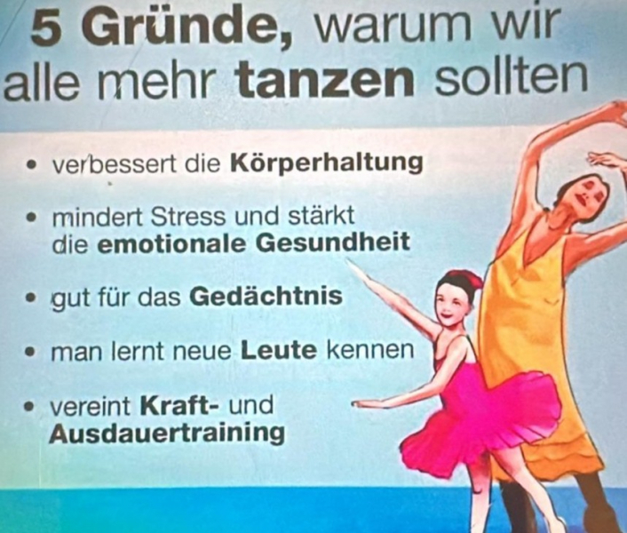 Ab Mittwoch, den 28. Januar 2026 sind von 18.30 - 19.30 Uhr in der großen Halle am Gymnasium alle herzlich Willkommen, die Spaß haben sich nach Musik tänzerisch zu bewegen und dabei nette Menschen kennenzulernen. Bei meinen Übungstreffen steht der Spaß und die Bewegung im Vordergrund. Erlebnistanz trägt in vielerlei Hinsicht zur Gesundheit bei: Er fördert die Beweglichkeit, das Reaktionsvermögen, den allgemeinen Fitnesszustand und die Konzentration.